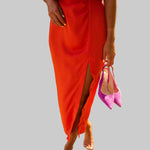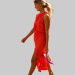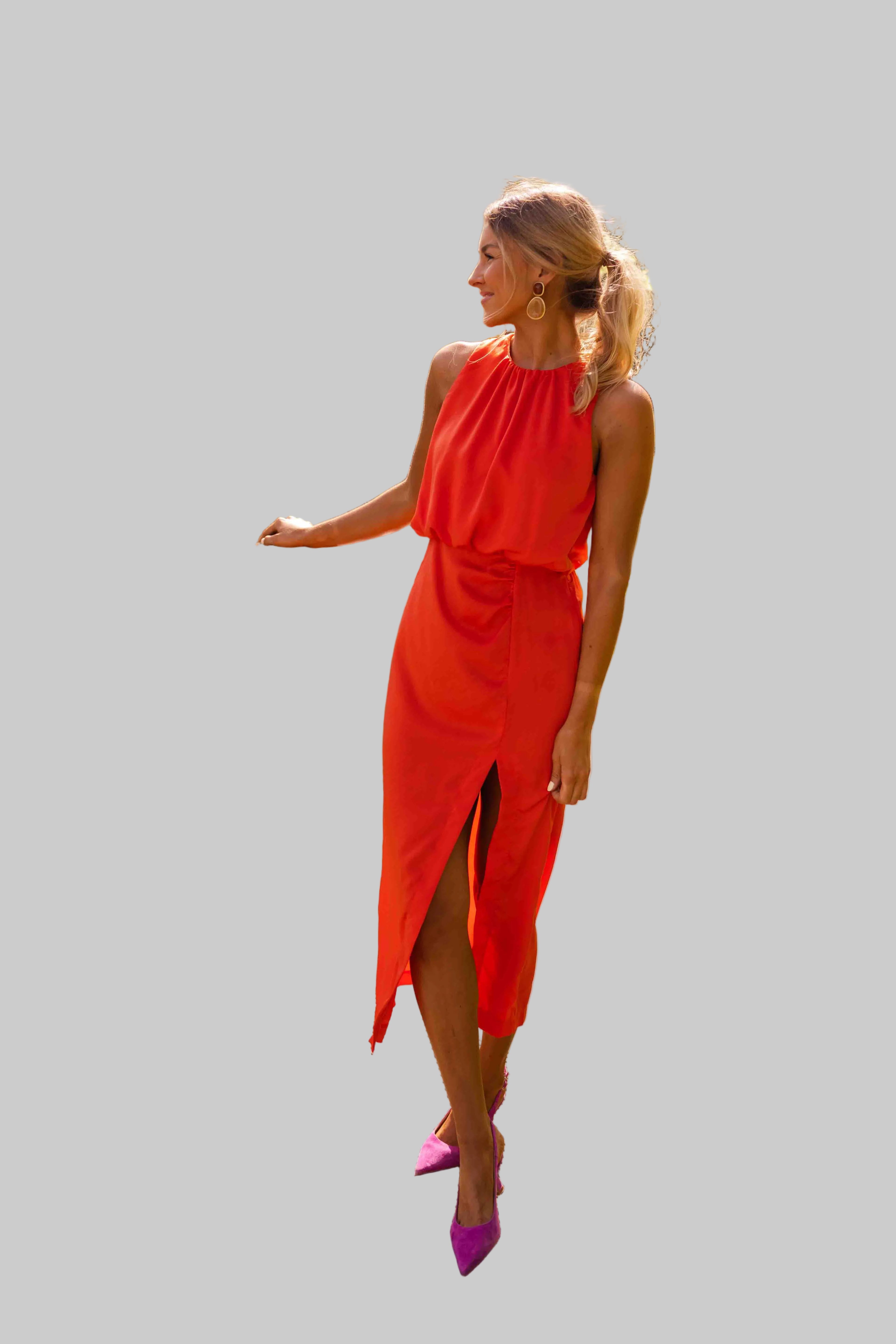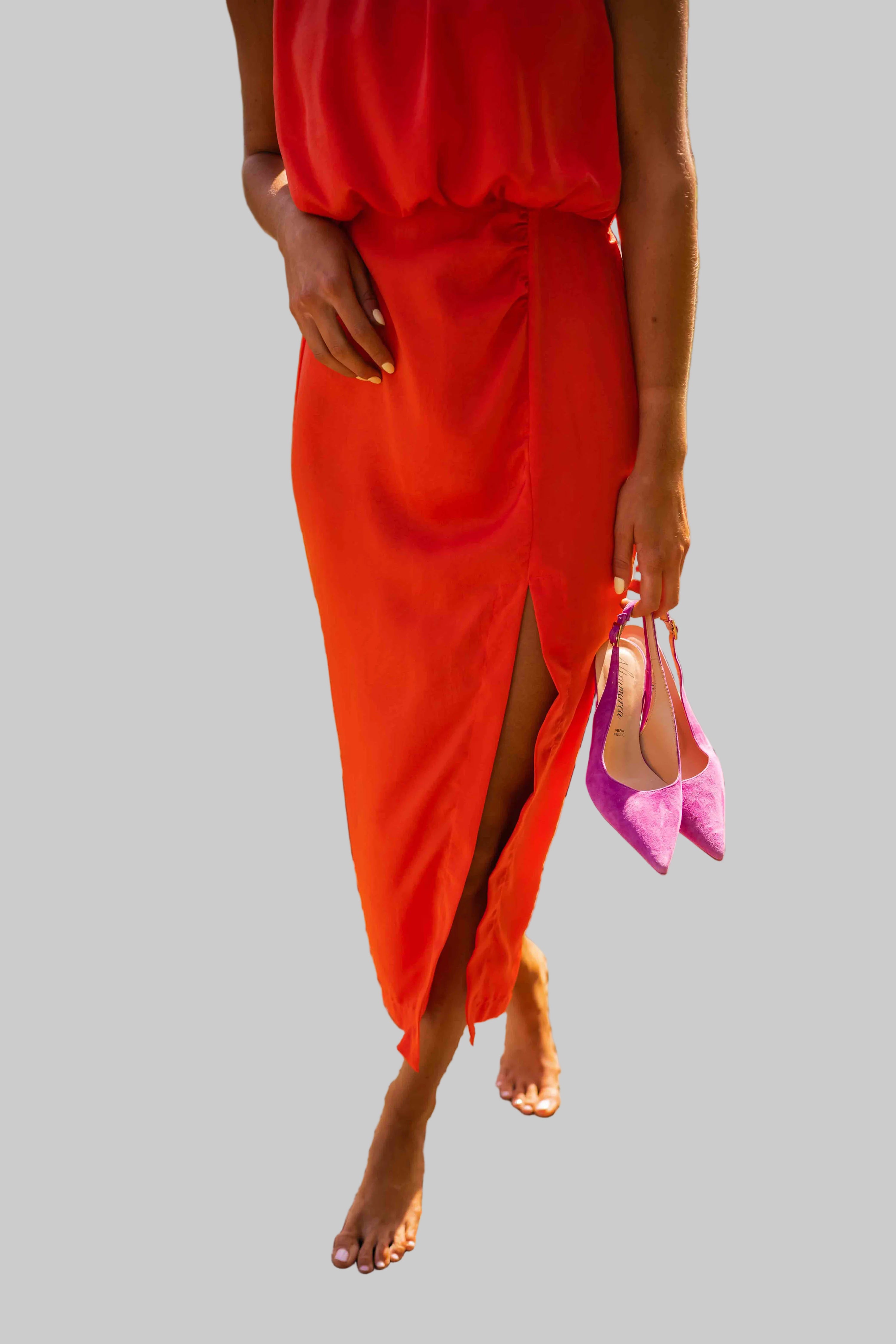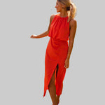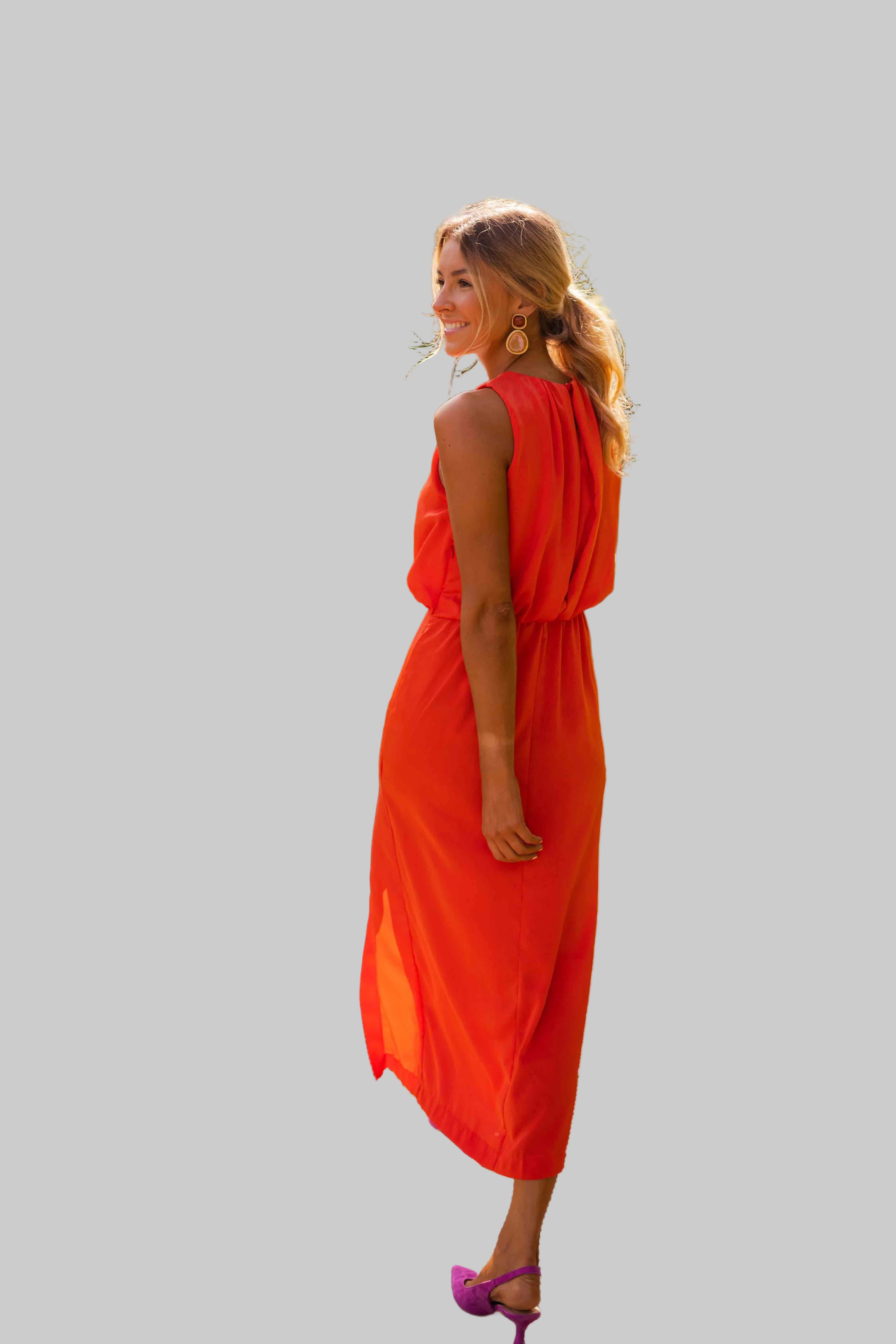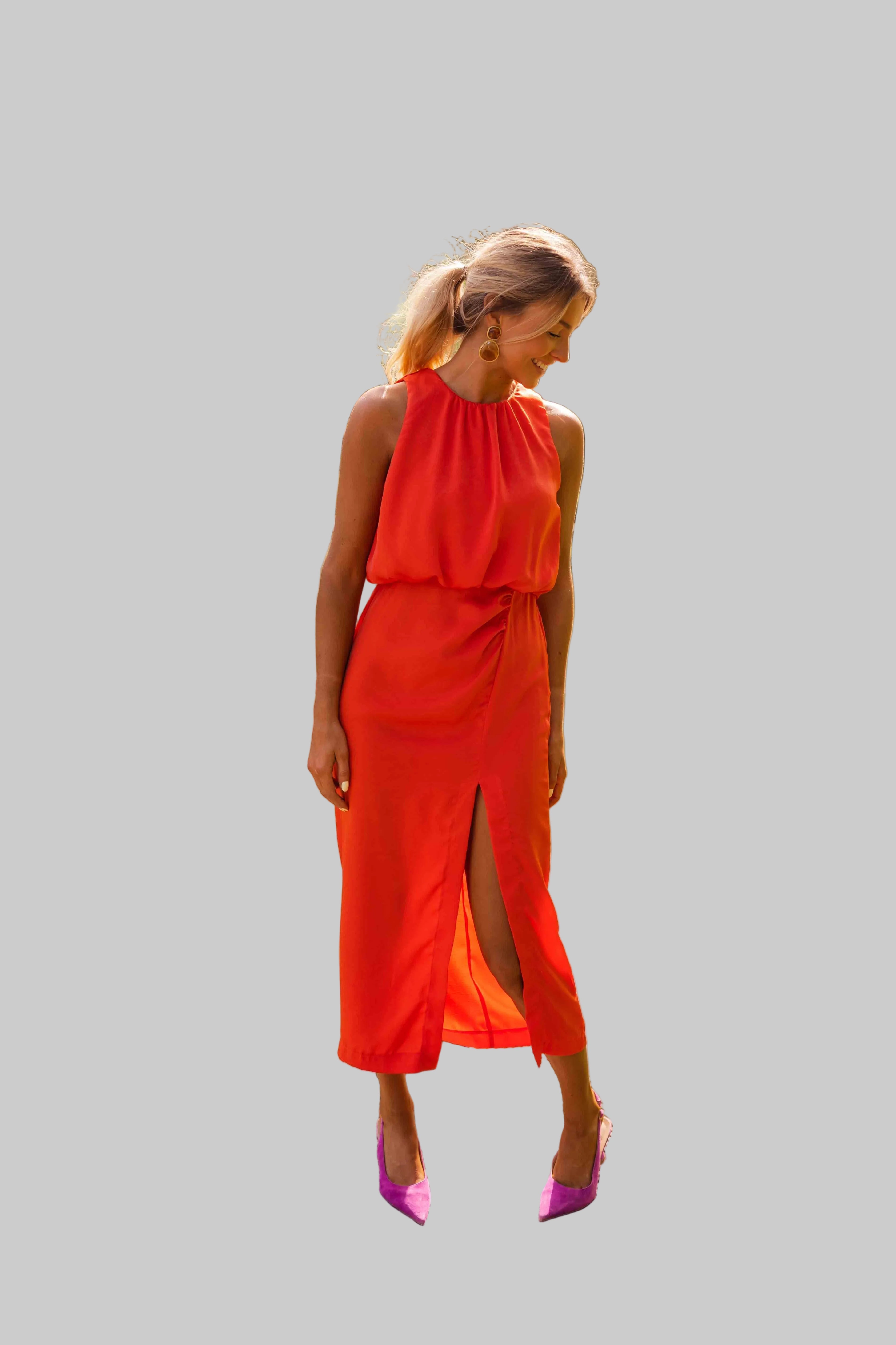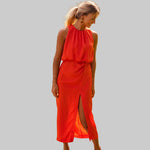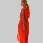 Anđela je oličenje sofisticirane ženstvenosti i lagane mediteranske gracioznosti – midi haljina koju obučeš kad želiš zračiti klasom na sunčanoj šetnji rivom, elegantnoj obiteljskoj večeri uz more, ljetnom vjenčanju na otoku ili romantičnoj večeri pod zvijezdama s prijateljima. S visokim ovratnikom, bezrukavnim dizajnom, uskim krojem koji nježno prati siluetu i diskretnim prorezom sa strane, savršena je za tople dane kada želiš izgledati besprijekorno uz potpunu slobodu kretanja.