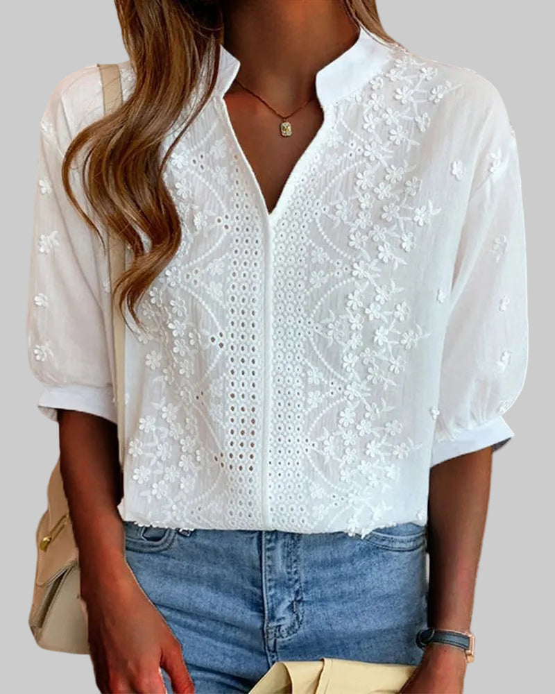 Dosta vam je običnih, prozirnih košulja koje nemaju karaktera? Bluza Elvira rješava problem bezlične svakodnevne garderobe. Spajajući fini vez s romantičnim puf rukavima i upečatljivim retro ovratnikom, ova bluza unosi umjetnički dodir u vaš stil. To je komad koji slavi vašu ženstvenost, pružajući vam onaj poseban osjećaj lakoće i profinjenosti, bez obzira na to koliko vam je dan užurban.