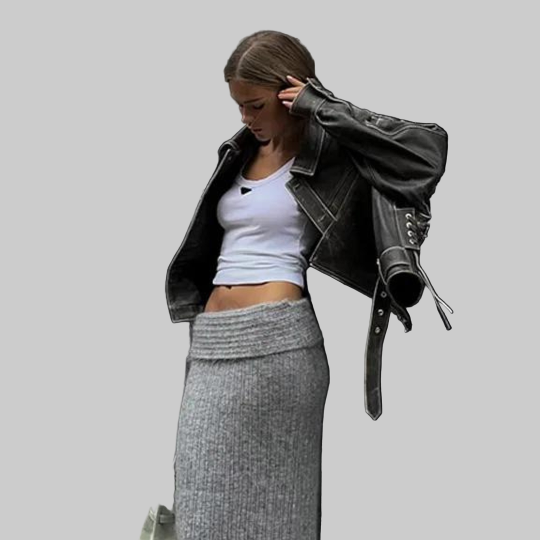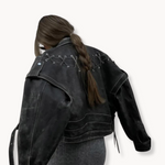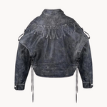 Obogatite svoju kolekciju Jagoda kožnom jaknom koja zrači bezvremenskim vintage šarmom i osigurava izgled koji nikada ne izlazi iz mode. Ovaj model inspiriran bikerima očarava asimetričnim zatvaračem, istaknutim reverom i podesivim remenom za optimalnu udobnost nošenja. Nježni čipkasti detalji daju jakni savršenu ravnotežu između odvažnosti i elegancije, čineći je jedinstvenim komadom za sve koji žele svojoj odjeći dodati dašak rafinirane pobune.
